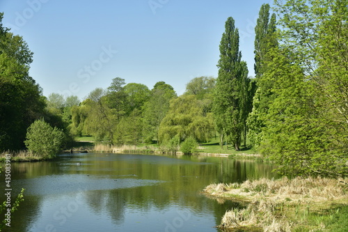 Végétation luxuriante au printemps le long d'un des étangs principaux du parc de Woluwe à l'est de Bruxelles