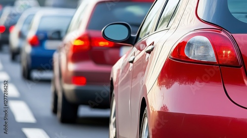 Vehicles on Asphalt Road with Reddish Pink Car in Focus and Traffic