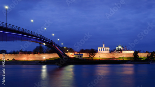 Veliky Novgorod, Russia. Veliky Novgorod Novgorod Kremlin, panoramic night view of Veliky Novgorod landmarks at night