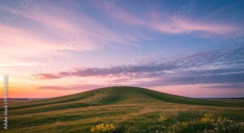 Verdant hill under sunset with colorful sky & wispy clouds