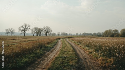 Verdant meadow set against distant barren trees and a cloudy horizon