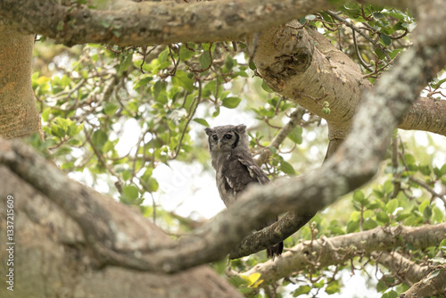 Verreaux eagle owl is hiding in the tree during day. Eagle owl during safari in Kruger national park. Ornithology in South Africa