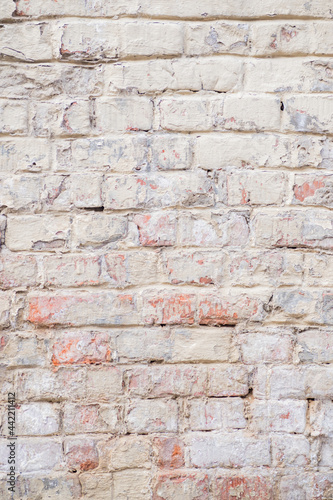 Vertical background with red brick wall with peeling plaster