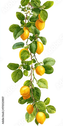 Vertical illustration of a lemon branch laden with ripe yellow lemons, lush green leaves, and a single delicate white blossom