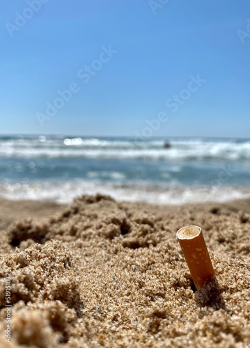 Vertical image of an extinguished cigarette butt, deposited and abandoned on the shore of the beach. Dirtiness and citizen laziness with respect to the care of the natural environment on the beaches