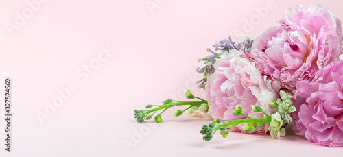 Very beautiful bouquet of flowers from peonies, and lilacs , spring plants close-up. Holiday concept. Flowers for Mother's Day. Copy space.