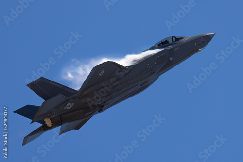 Very unusual close view of a F-35A Lightning II in a high G maneuver , with condensation clouds around the plane and afterburner on
