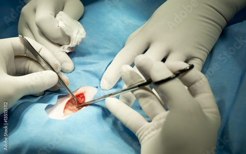 Veterinaian operates a sick pet usin surgical instruments