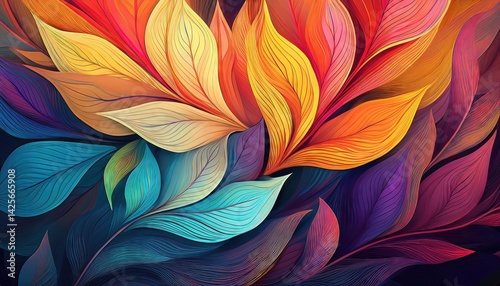 Vibrant Abstraction of Colorful Leaves A Kaleidoscope of Autumn Hues Swirling in a Whimsical Dance, Invoking a Sense of Mystique and Enchantment.