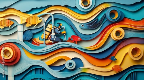 Vibrant and abstract paper cut style depicting an industrial diver working on a pipeline surrounded by layers of colorful ocean waves fish and dynamic underwater scenery