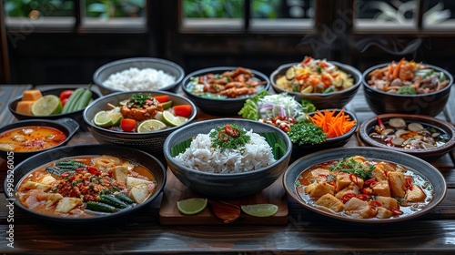 Vibrant Asian Cuisine Spread on Wooden Table