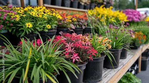 Vibrant Assortment of Colorful Flowers in Pots at an Outdoor Market Display