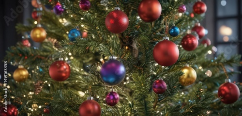 Vibrant baubles adorn a Christmas tree, bokeh lights glow , warm, twinkle, baubles
