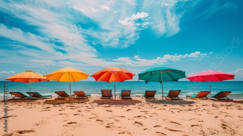 vibrant beach umbrellas and sun loungers create a picturesque seaside scene, symbolizing the essence of summer vacations