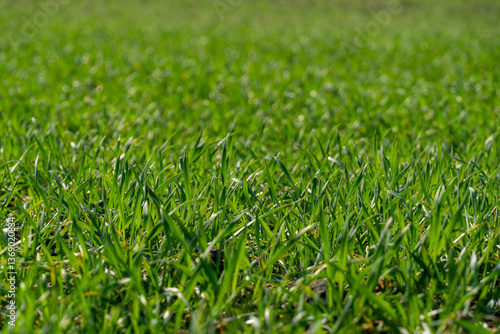 Vibrant blades of grass sway gently in the afternoon breeze under a clear blue sky during a warm spring day in a rural area