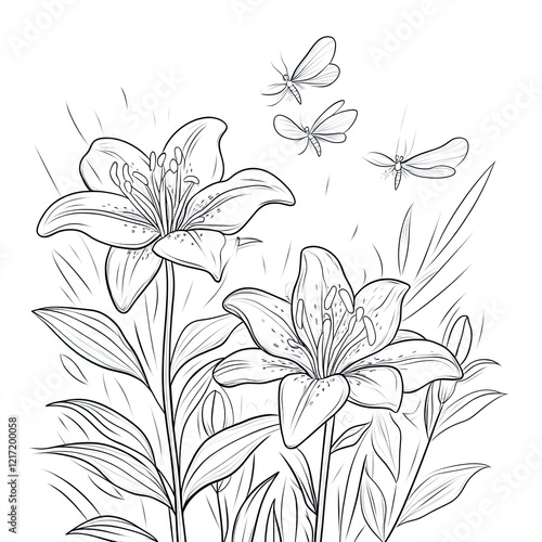 Vibrant Blooming Lilies and Dragonflies Serene Nature Image
