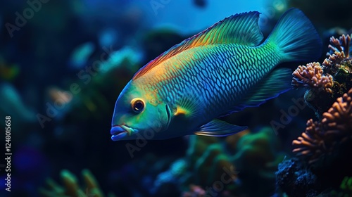 Vibrant blue and green fish swimming amidst coral reef.