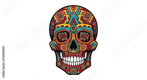Vibrant Calavera Illustration for Day of the Dead Celebrations, Featuring Intricate Aztec-Inspired Patterns and Bold Colors, Ideal for Cultural Events