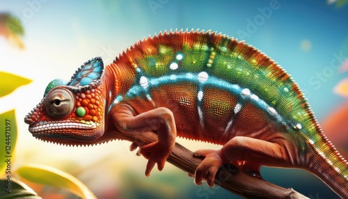 Vibrant Chameleon Hiding Amongst Lush Tropical Rainforest Foliage, Surrounded by a Blaze of Colorful Exotic Flowers, in an Enchanting Cartoon Scene.
