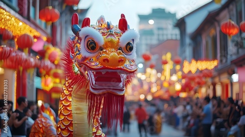 Vibrant Chinese New Year Dragon Leads Lively Parade Through Festive City Streets Decorated with Traditional Red Lanterns and Celebrating the Joyous Holiday
