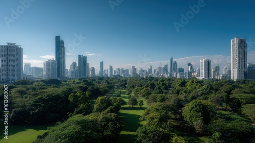 Vibrant cityscape featu modern skyscrapers towe over lush green park with clear blue sky and mountain range in the background