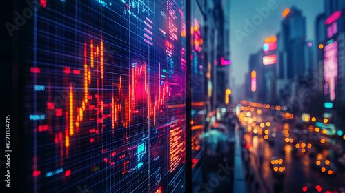 Vibrant Cityscape with Dynamic Stock Market Data at Night