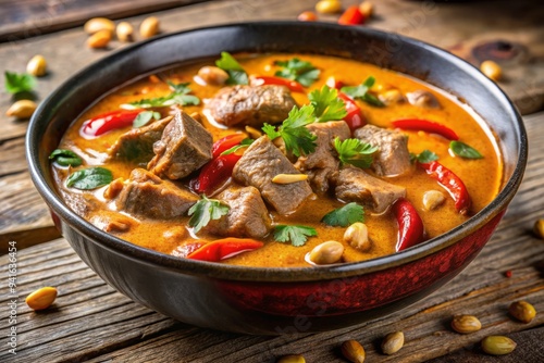 Vibrant close-up macro shot of creamy Panang Curry with tender beef and crunchy peanuts in a steamy coconut-based sauce on a rustic wood surface.