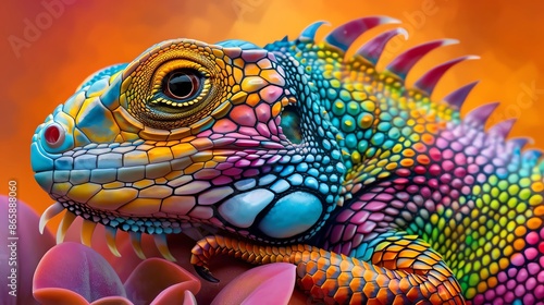 Vibrant close-up of a colorful iguana with intricate scales and striking hues against a gradient background. Perfect for nature and wildlife themes.