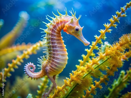 Vibrant close-up of a delicate seahorse grasping a slender seaweed strand, showcasing intricate details and pastel colors in a serene underwater scene.