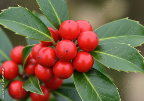 Vibrant cluster of red holly berries with glossy green leaves and sharp points symbolizing winter season, festive decoration, natural holiday foliage and traditional christmas plant