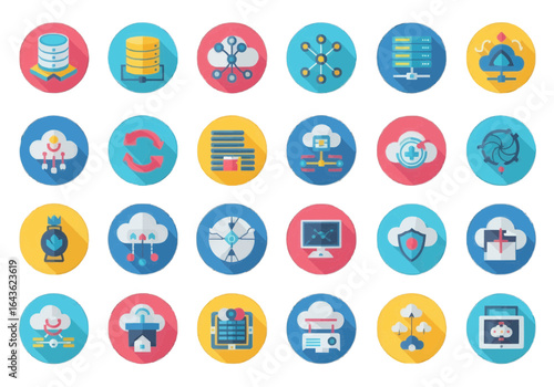 Vibrant collection of flat design icons illustrating concepts of data management, cloud computing, network infrastructure, and cybersecurity for modern digital systems.