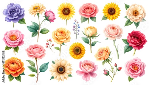 Vibrant collection of painted roses, sunflowers, and other blossoms on white
