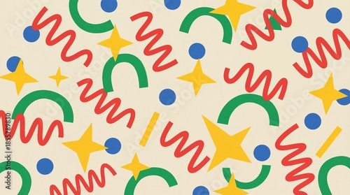 Vibrant colorful pattern with stars, squiggles, and shapes on cream background