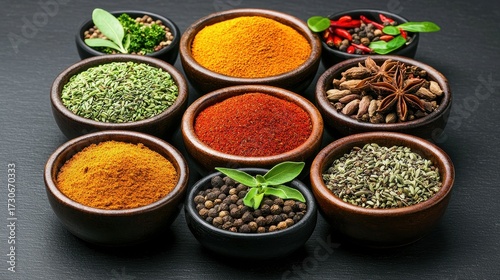 Vibrant Colorful Spices and Herbs in Wooden Bowls on Dark Background