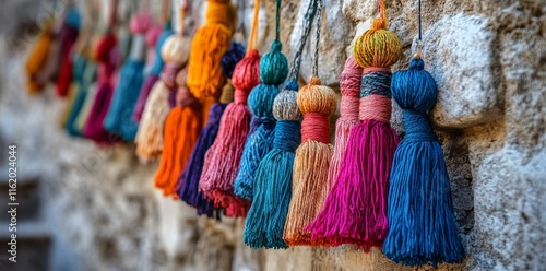 Vibrant colorful tassels arranged in front of an old stone wall. AI generated illustration
