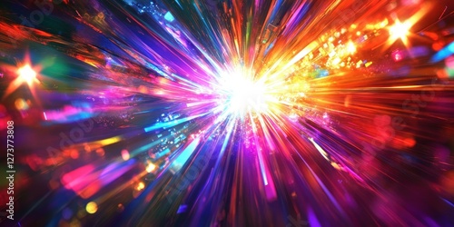 Vibrant colors explode in an abstract starburst at the heart of a dynamic backdrop, radiating energy with swirling hues and intricate patterns