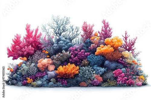 vibrant coral reef ecosystem isolated on white background diverse array of colorful coral formations tropical fish and marine life intricate details showcase underwater biodiversity