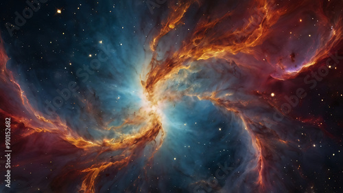 Vibrant cosmic nebula resembling a phoenix rising, fiery and majestic, with copy space