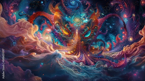Vibrant Cosmic Octopus in a Surreal Dreamscape with Swirling Colors and Galactic Elements