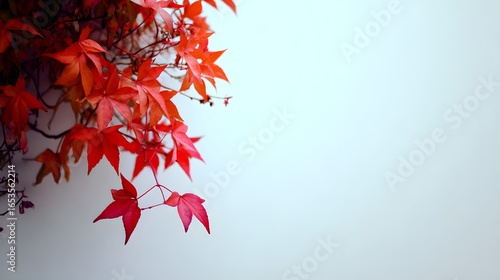 Vibrant crimson leaves cascade gracefully down a light gray wall, creating a beautiful autumnal scene.
