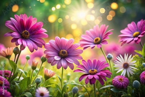 Vibrant Daisies in Springtime: A Floral Background with Pink, Purple, and Green Colors, Featuring a Dreamy Bokeh Effect for Nature and Gardening Enthusiasts
