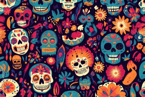 Vibrant Day of the Dead skulls and flowers pattern in bright colors on a dark background, perfect for festive and cultural designs.