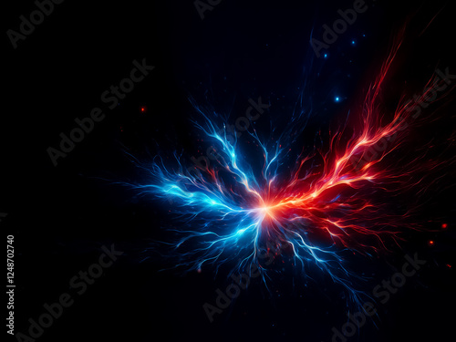 Vibrant digital art featuring a dynamic clash of cool blue and fiery red energy fractals against a stark black backdrop, creating a visually striking contrast.
