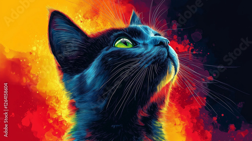 Vibrant Digital Artwork of a Black Cat with Neon Lighting and Fiery Background