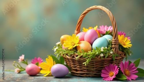 Vibrant Easter eggs in a basket overflowing with colorful spring flowers , daffodils, joy, hyacinths
