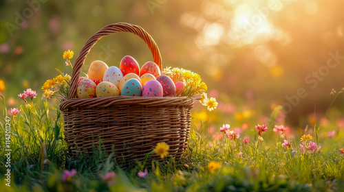 Vibrant Easter eggs in a basket surrounded by blooming flowers, symbolizing life, spirituality, and resurrection. Perfect for celebrating Easter and its religious significance.