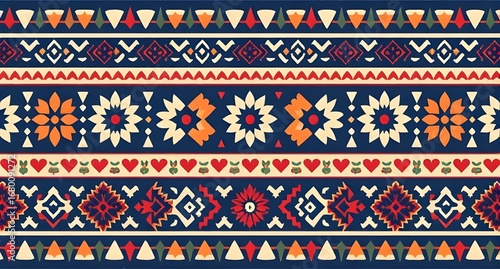 Vibrant ethnic folk pattern art with geometric flower and heart motifs for textile design and backgrounds