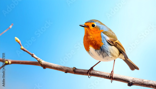 Vibrant European Robin Perched on Branch against Clear Blue Sky