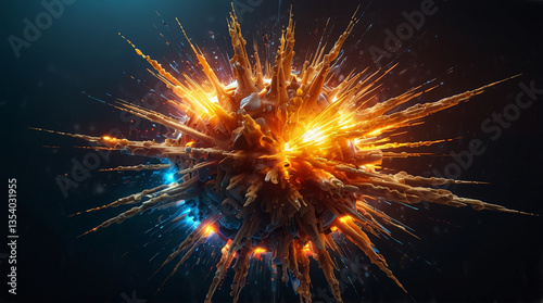 vibrant explosion of colors and textures, this abstract image showcases spherical shape radiating spikes and bursts of light, creating dynamic and energetic visual effect. interplay of warm