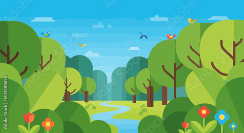 Vibrant flat vector illustration of a peaceful cartoon forest scene